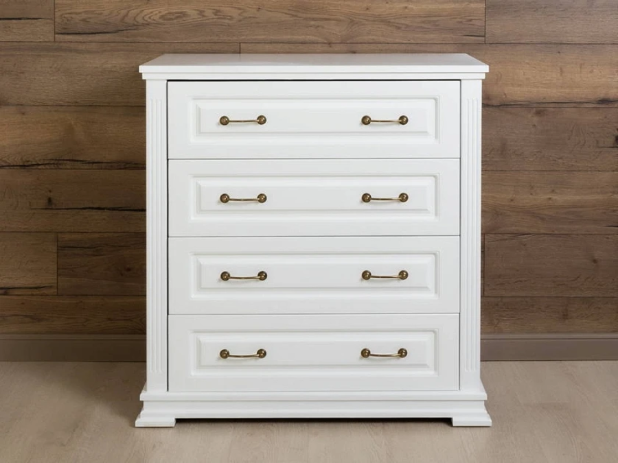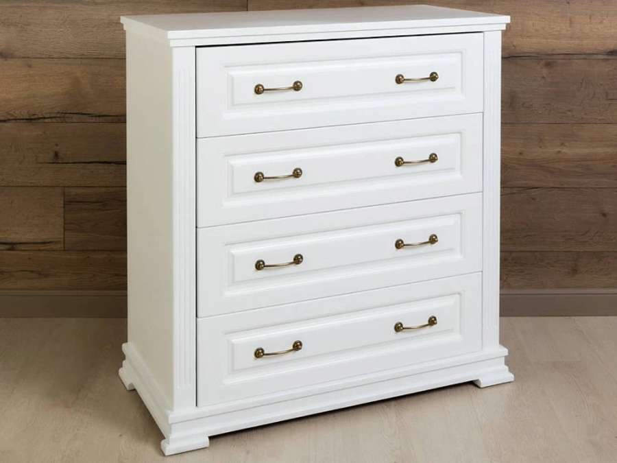 Milena - комод для тех, кто выбирает мебель один раз и надолго. Каркас и фасады из натурального массива, защитное лаковое покрытие, которое проявляет неповторимую текстуру дерева и никакой бумажной плёнки, которая вздувается через год. Четыре глубоких ящика на шариковых направляющих полного выдвижения делают хранение удобным, а вес 61 кг. говорит о плотности материала без лишних слов.